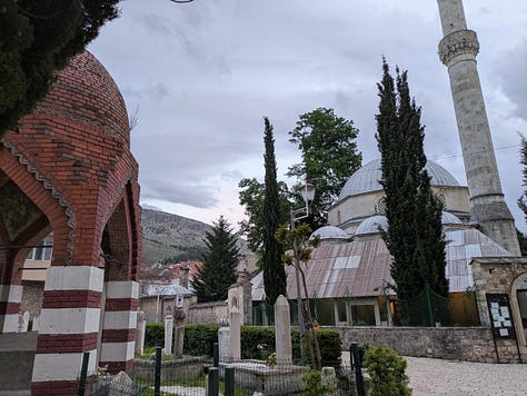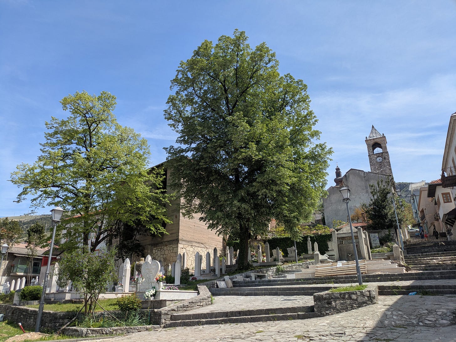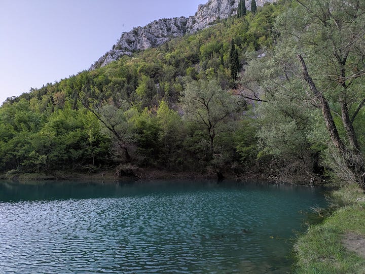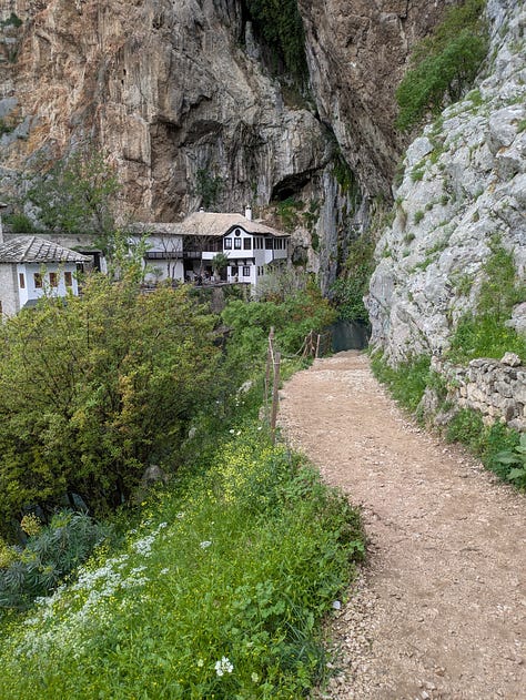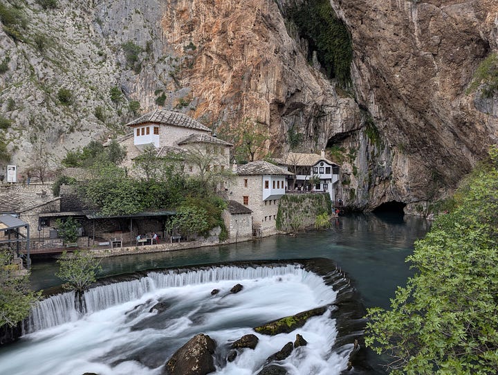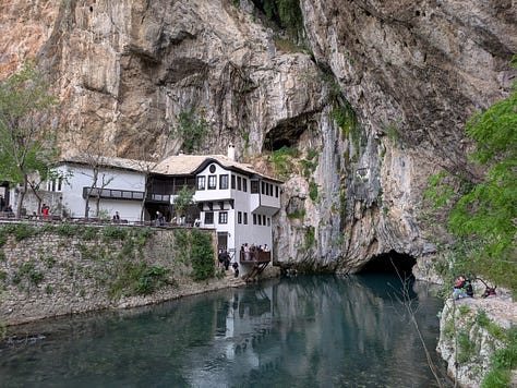 After we'd finished working for the day, we wandered into the main part of Blagaj to investigate the area. The main attraction in town is the Blagaj Tekija, an old Sufi Monastery right by the source of the Buna river. This seems to be a staple on the tourist trail here as there seemed to be plenty of room for parking, we saw a couple of coaches, and the road to the Tekija is lined with kiosks selling various souvenirs. Archeological excavations show that the site was in use before the arrival of the Ottomans, but the earliest surviving written records date to 1664 where it is described as a well-known site across the Ottoman Empire. We crossed the river to enjoy the view before heading back to Faris and Megan's.
