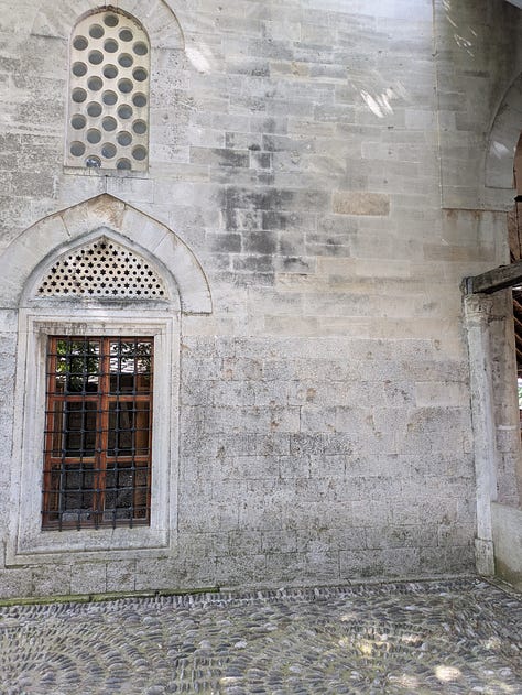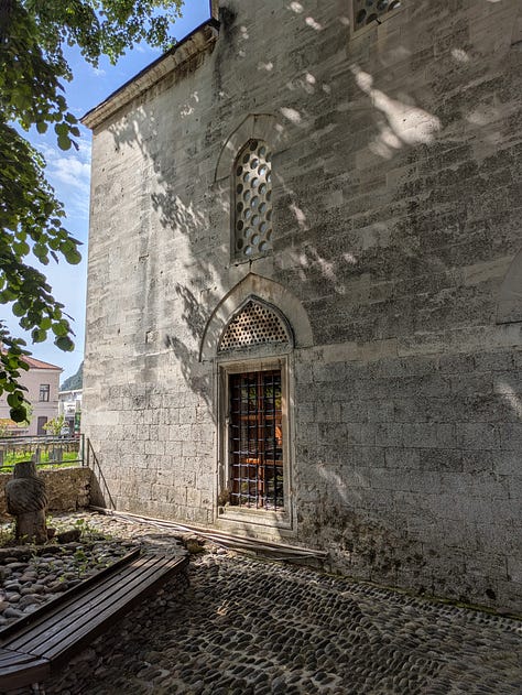 To end our tour, we visited a couple of places outside of the restored old town. First was Karadoz Beg mosque. As the mosque is outside the official UNESCO world heritage site, it did not receive international funds for reconstruction. Reconstruction was funded by the community, resulting in reuse of materials where possible. To this day, the side of the mosque has the visible evidence of the war: bullet holes and scars from shrapnel.