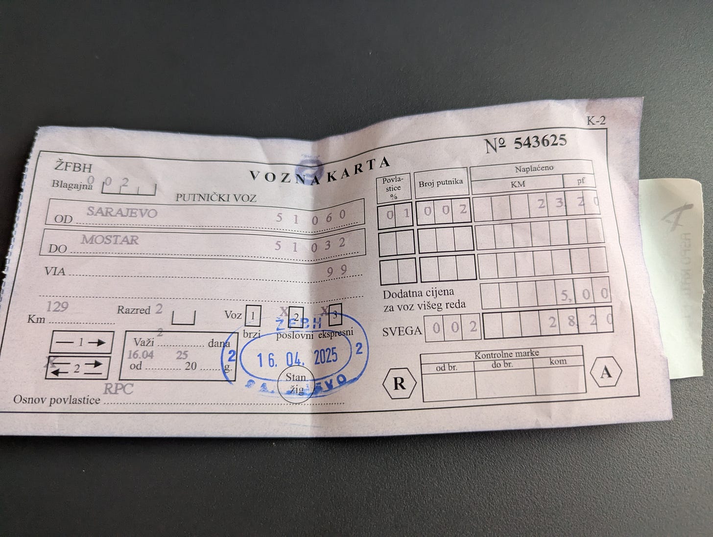 We decided to take the train from Sarajevo to Mostar as it was both cheaper and faster than the bus. Trains also tend to be more comfortable than busses, so it seemed like a win-win-win decision. However, getting our hands on tickets seemed to be a bit more complicated than necessary. We tried to buy in advance, but were told it is only possible to buy tickets on the day of departure. The morning train left Sarajevo at 7:15am, so we had an early morning and arrived at the station around 6:30am. With only one ticket window open, the queue was slow. Luckily we beat the rush and there weren't many people in front of us; we didn't stick around, but it looked like the people at the end of the queue might have struggled to buy a ticket in time to catch the train. In the end we managed to procure an old-fashioned looking ticket and make our way to the train with plenty of time to spare - off to Mostar! Interestingly, it seemed like quite a few locals just got straight onto the train and bought tickets from the inspector after departing; this would be a much less stressful method, but it wasn't quite clear if you're supposed to do this and we wouldn't want to risk getting a fine (especially since we don't speak Bosnian…).