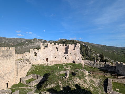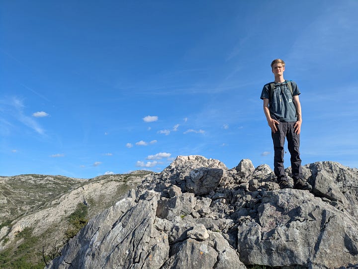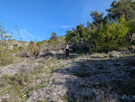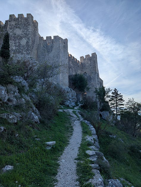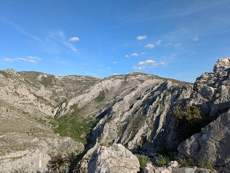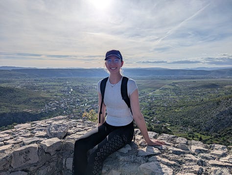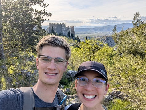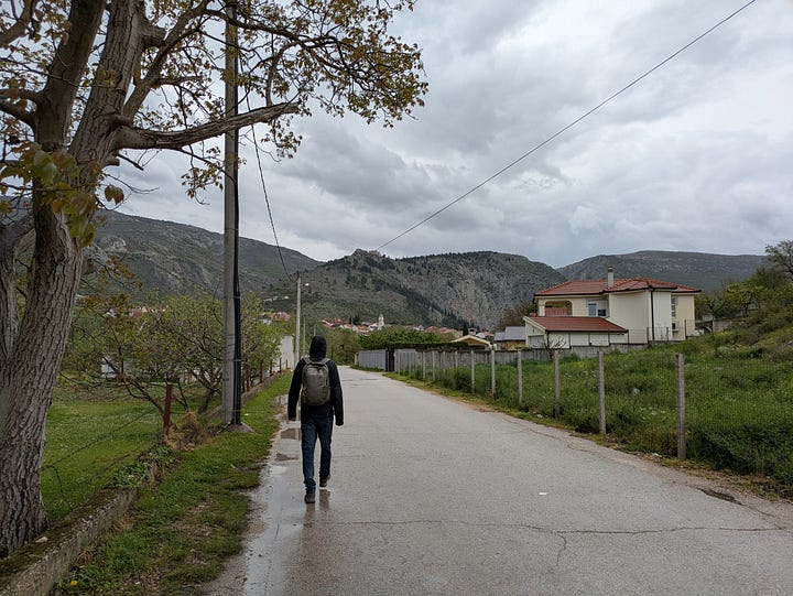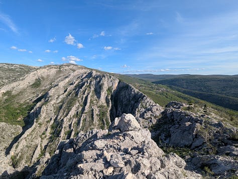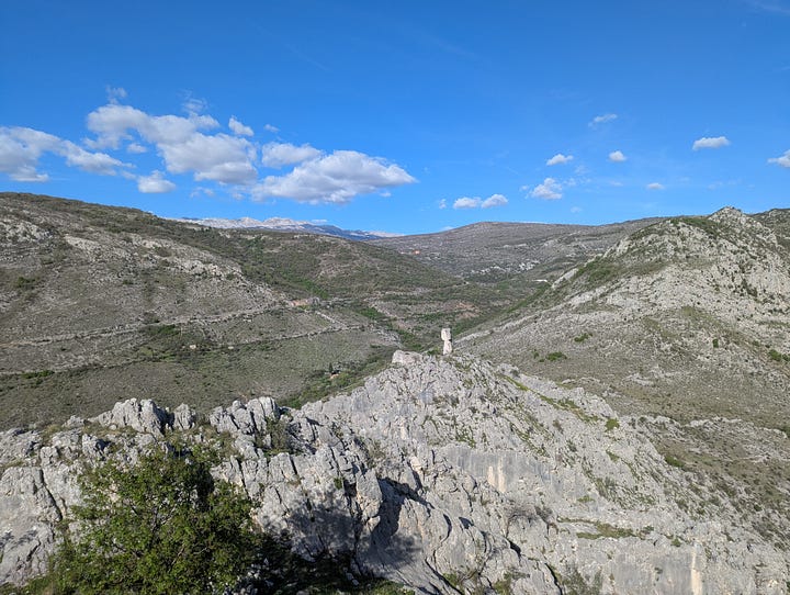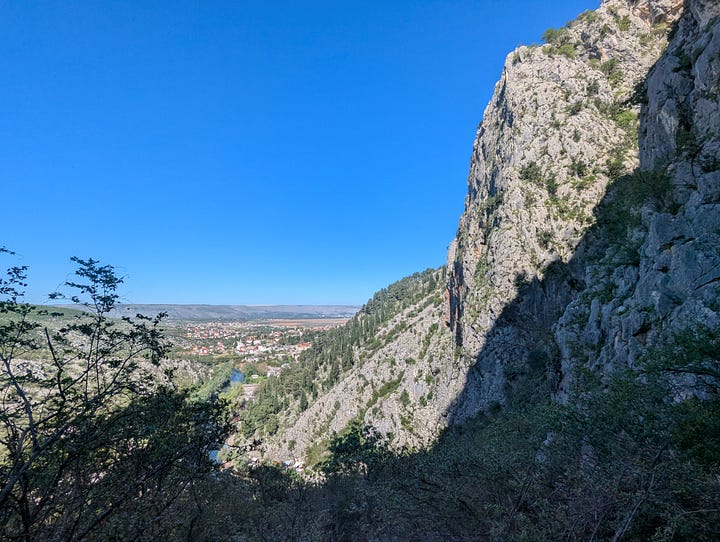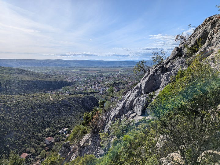 We relaxed with Megan while Faris was at work. In the afternoon, we went on a hike continuing along the easier trail then setting off into the unknown to make a circular route to Herceg Stjepan's Fortress - a hilltop castle overlooking Blagaj. The easy trail ended shortly past some rock climbing routes; from here, it really was an indiscernible trail through a pretty steep and rocky area. Only some minor scrambling was required and we were rewarded with fantastic views from a peak labeled “Orlovača” on Scott's map: a view over some interesting rock formations on the next mountain, the ruins of what Google suggests is a Roman watchtower, Herceg Stjepan's Fortress which was now below us, and the valley stretching away from Blagaj.