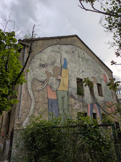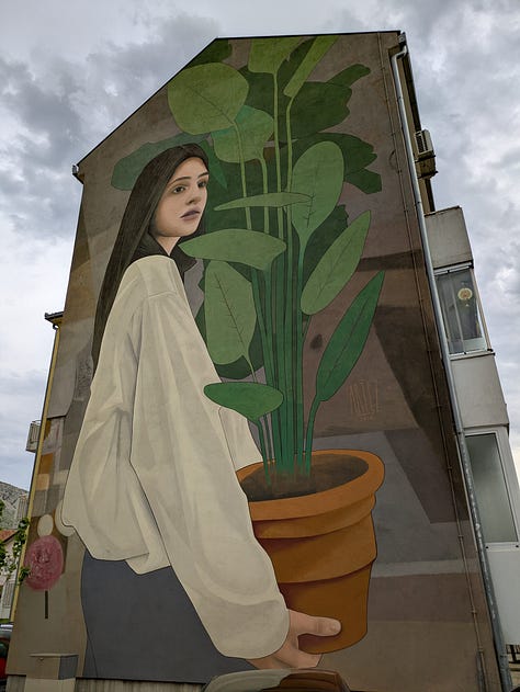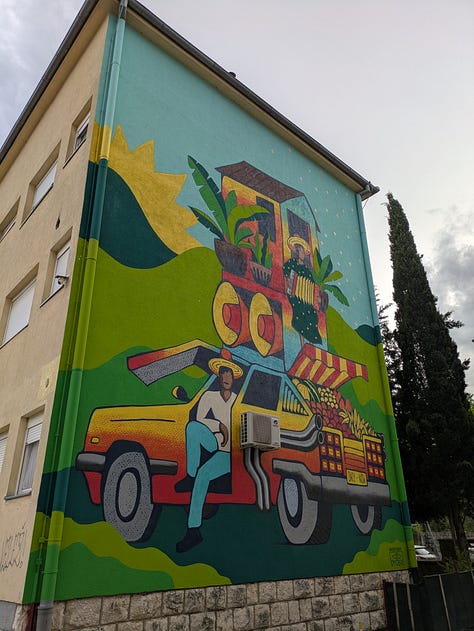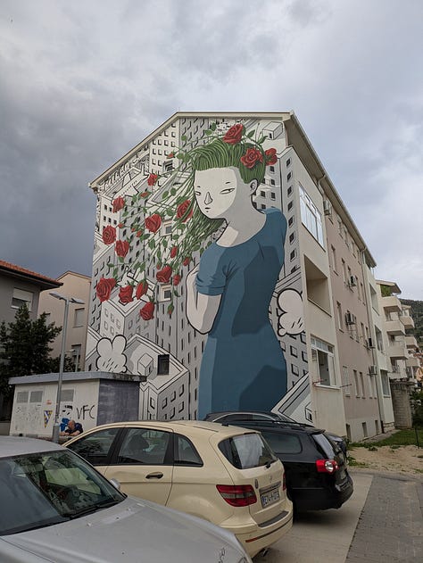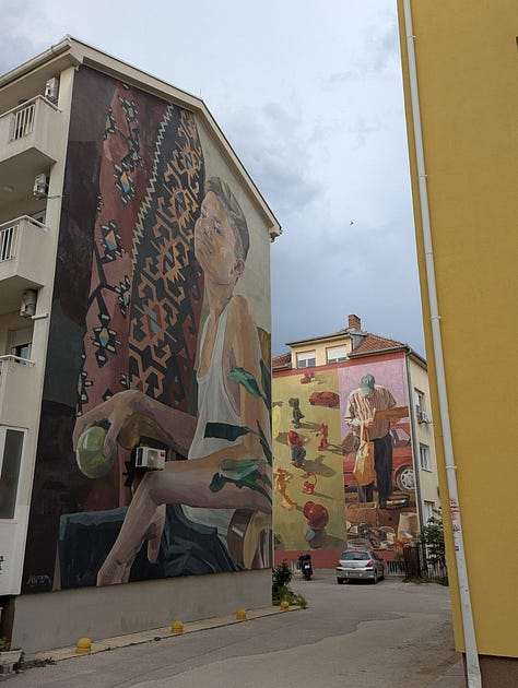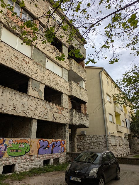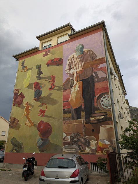 Around 6 pm we headed out to Mostar. Faris had an appointment for a haircut, so while he did that Megan took us on a little tour of parts of Mostar away from the old town. The highlight was a slightly strange residential neighborhood which was bordered by the prison. The prison wall and the ends of residential buildings were covered by street art; part of on installation suggested this is part of a regular street art festival in Mostar. Another peculiarity of the neighborhood (the first being a prison right in the middle of a residential neighborhood) was the bullet hole riddled shells of buildings interspersed between those that had been repaired or reconstructed. Almost three decades after the end of the war, the scars of war are very much still visible away from the touristy centre of the city.