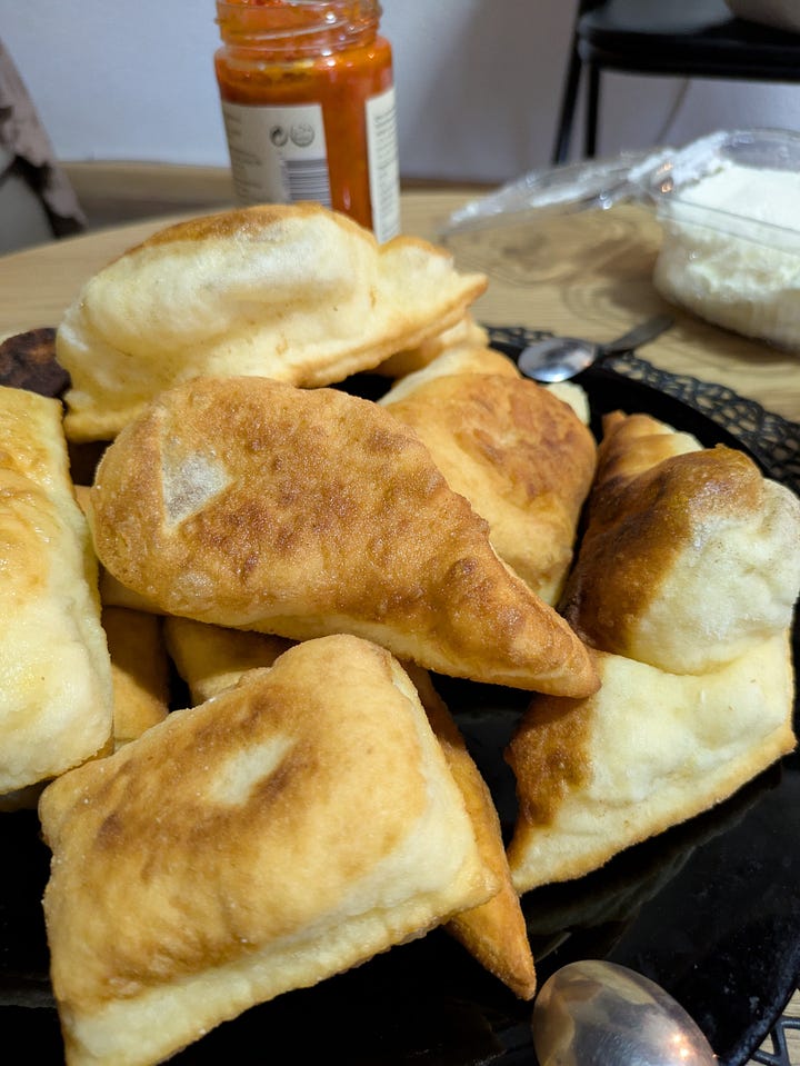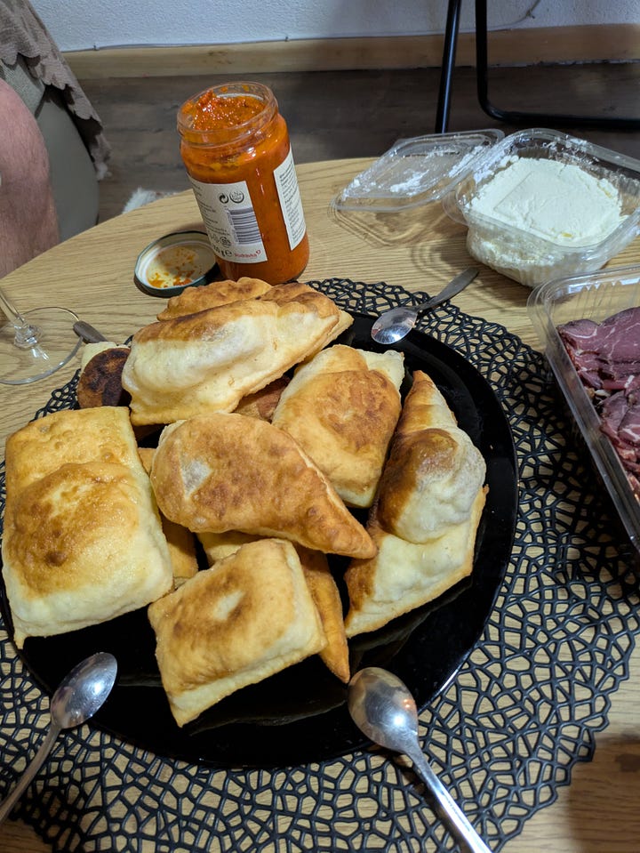 In the evening, we joined Megan and Faris for a gorgeous dinner and lovely chats. Megan made Bosnian peksimeti as an appetizer, which are fried dough balls. We ate them with ajvar, kaymak (soft delicious white cheese), and smoked meat; they probably would be delicious with any savory sauce or even as a dessert with something sweet. We also had chicken, fish, salad and roast veg - the original plan was to BBQ, but the weather turned stormy in the evening.