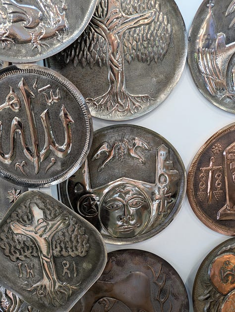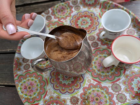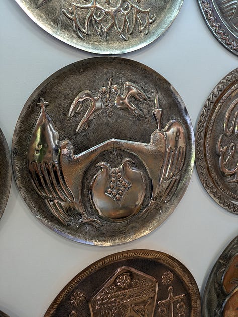 Today we got up early and went into town with Megan and Faris who had work and an appointment. We sat around and had coffee together, then went our separate ways. We did a final wander of the old town and had some borek from the bakery recommended by our tour guide. Mary also went into the copper shop that our tour guide had recommended and bought a beautiful handmade ring for 10 euros after spending a long time being indecisive about the options. This copper shop is run by an older couple. They are an interfaith couple: Muslim and Catholic. The man showed us the beautiful plates he makes of Mostar for tourists, with the old bridge connecting the Croatian and Muslim communities, with a church on the left side and a mosque on the right side of the bridge. The plate is also decorated with symbols such as doves for peace, and a pomegranate symbolizing abundance and prosperity. He does this art to show people that peace is valuable and important. His wife and daughters make the jewelry, and he and his son make the plates and Bosnian coffee sets.