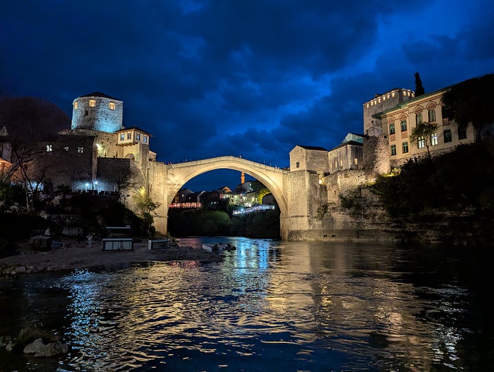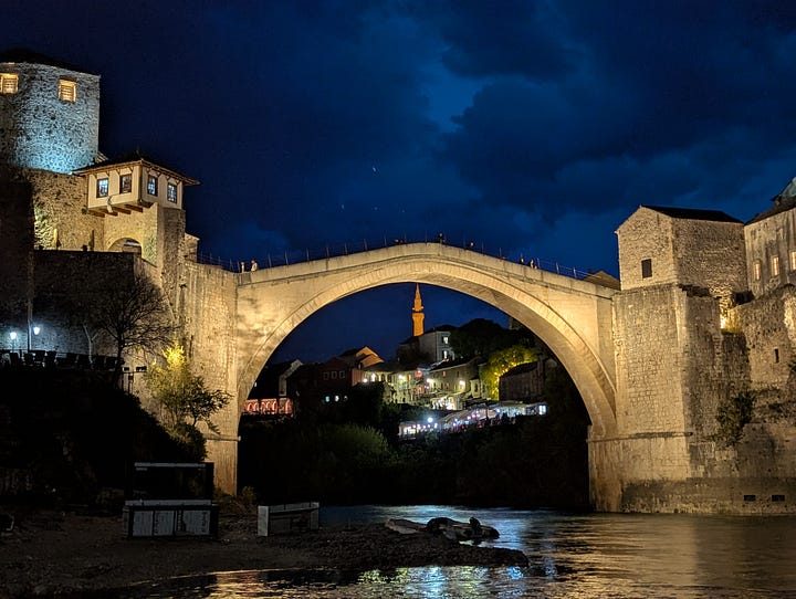 In the evening we went on an impromptu trip into town; Faris's dad was driving Megan to Mostar, so we hitched a ride. We wandered through the beautiful “Old Town” of Mostar for the first time in twilight and then in the dark. Megan told us that Mostar has surprisingly good ice cream for a tourist town in Bosnia; explaining that a lot of people fled to other countries such as Italy when the war began. Some of them eventually returned and brought gelato back with them. We suspect that a constant stream of tourists in recent years and very hot summers (we were told it can get well into the 40s in Mostar) also help to drive demand. It was a mild evening and we decided to enjoy ice cream and then some craft beer before joining up with Megan and Faris at the restaurant where Faris works. We had some rakija and tried to stay out of the way while they were closing up before heading back to Blagaj.