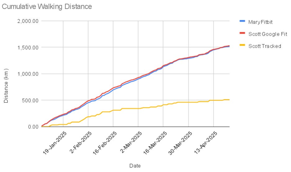 This week we also walked an uncharacteristically short distance. We only walked about 49.2km or just over 7 km/day. This takes our 106 day total to 1517.4km.