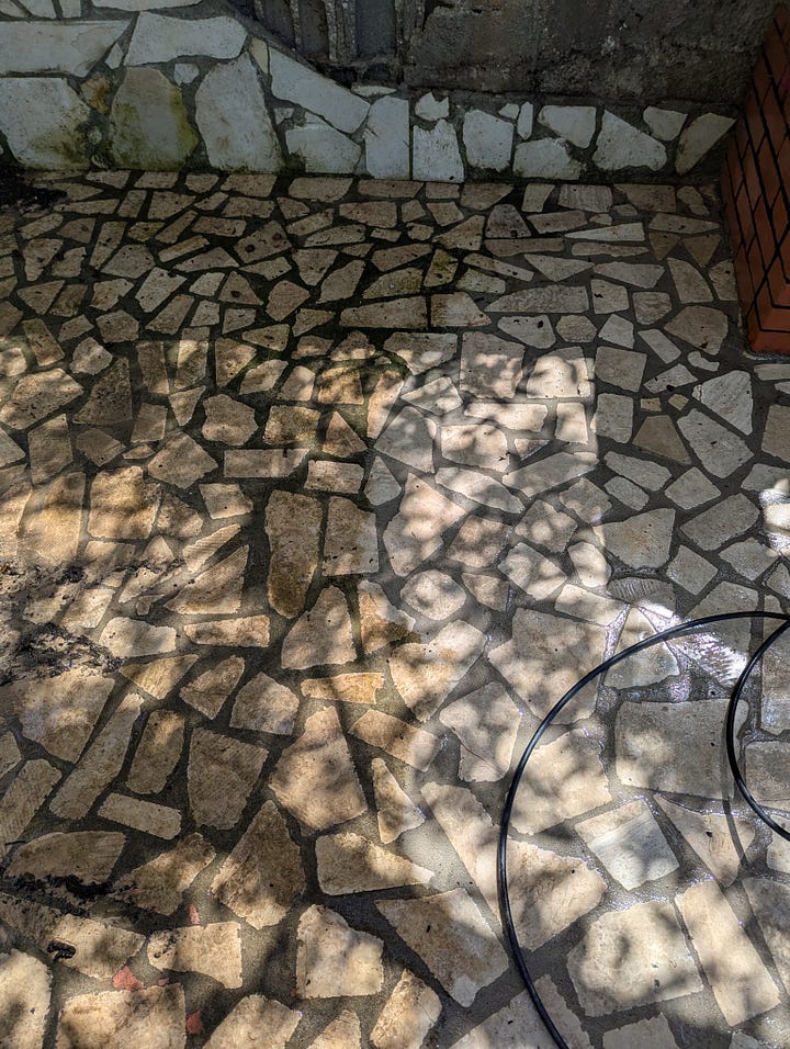 Today Scott power washed the path and the riverside patio; some combination of the size of the area, quite a bit of grime, and the strength of the power washer made this a slow process. Meanwhile, Mary weeded and overturned the soil at the base of the trees in the garden.